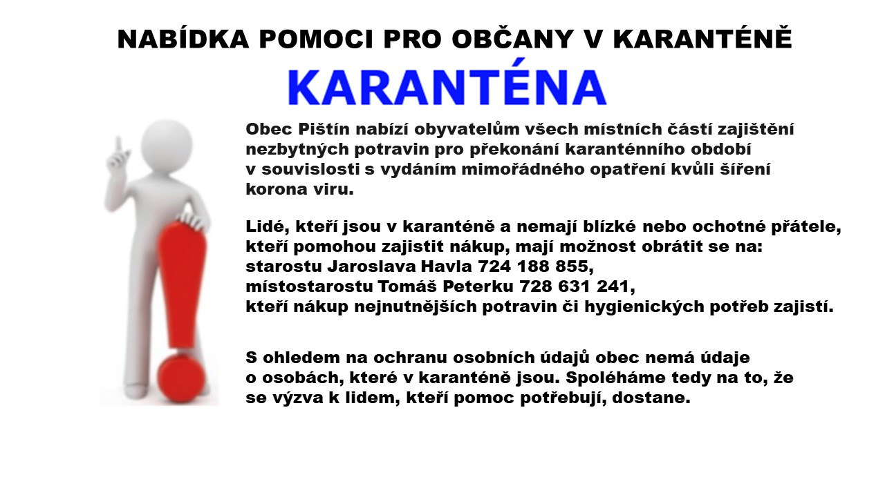 S ohledem na ochranu osobních údajů obec nemá údaje o osobách, které v karanténě jsou. Spoléháme tedy na to, že se výzva k lidem, kteří pomoc potřebují, dostane.