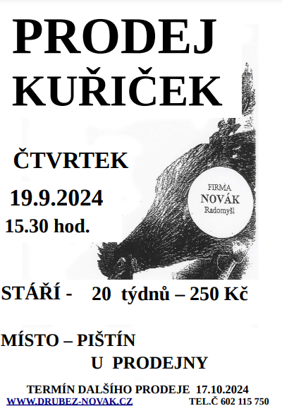 leták prodej kuřic Ve čtvrtek 19.9.2024 od 15:30 proběhne v Pištíně u obchodu prodej kuřiček. Podrobnější informace na přiloženém plakátu.